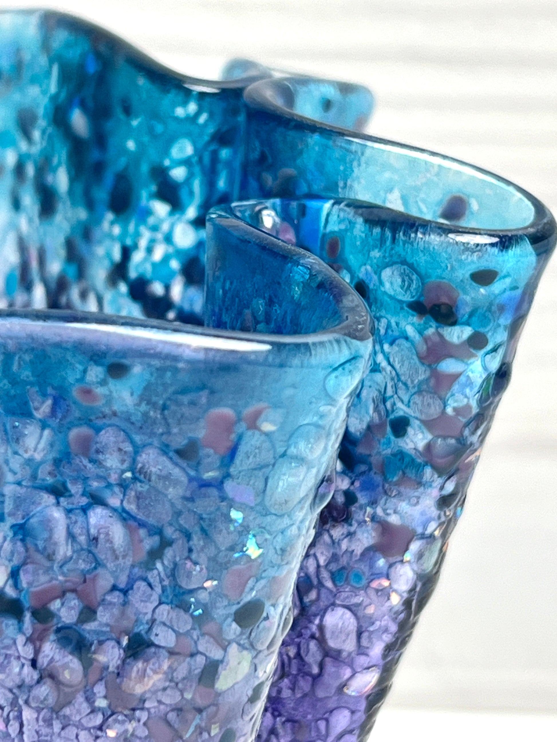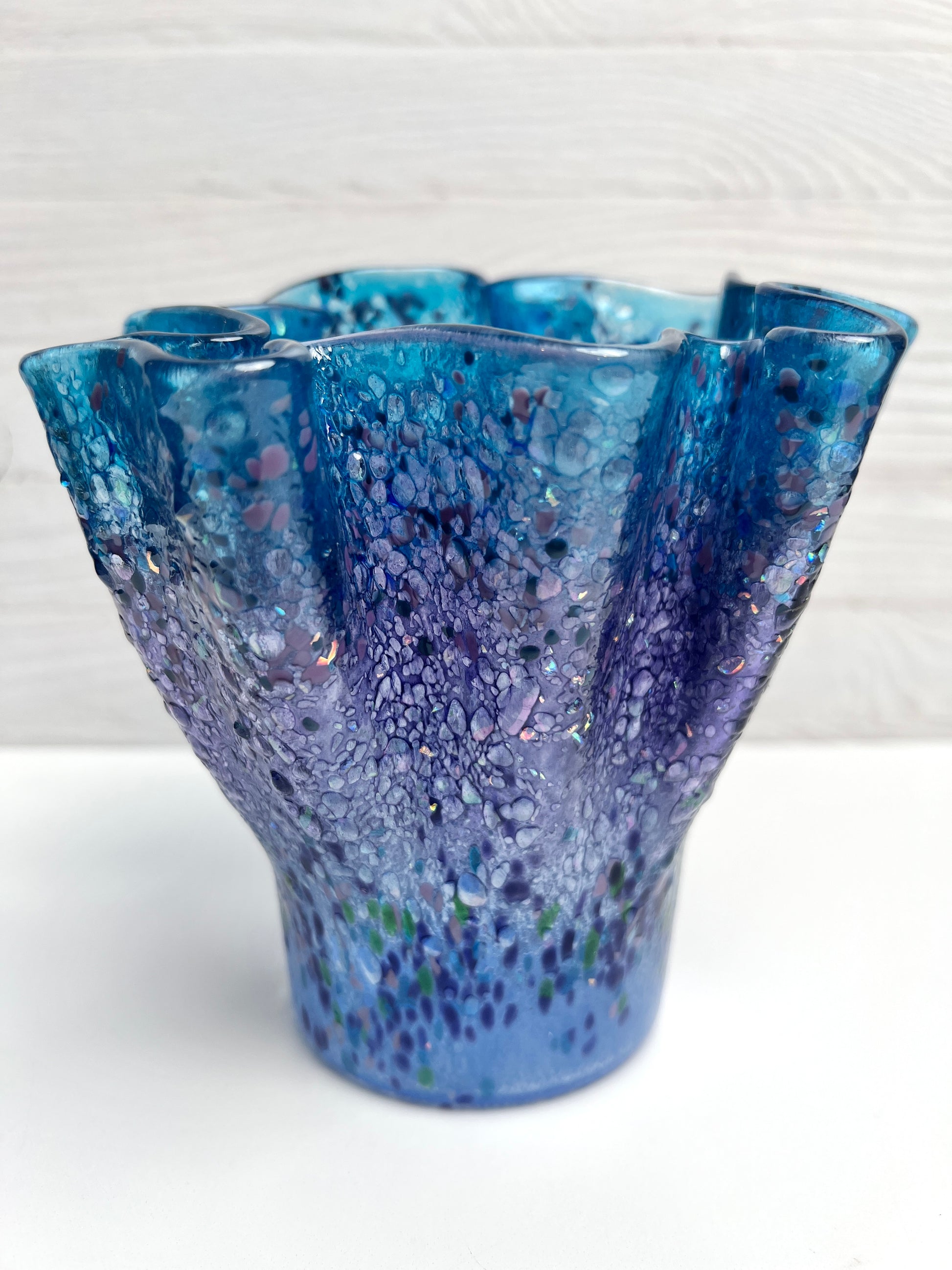 Gorgeous blues and purples swirl throughout this one of a kind, fused glass vase. Cobalt, indigo, aqua, royal purple and chips of iridescent glass play with the light and create translucent harmony.